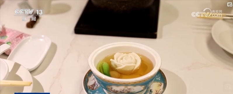 不僅僅是氛圍的打造,菜品創(chuàng)意也在還原原著中十二道菜品的基礎上,再對其進行創(chuàng)新和延伸, “可卿山藥棗泥糕”“鳳姐火腿肘子”“寶釵胭脂鵝”等獨具紅樓特色的菜品,都可以在這里吃到。這朵以假亂真的花朵是這里的一道招牌菜,由魚茸制作而成的“黛玉傳花”,來自上海的房阿姨對這道菜尤為喜愛。