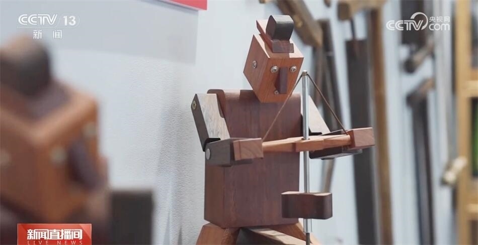 山東省非物質(zhì)文化遺產(chǎn)“橋氏木作”技藝傳承人喬一兵在工作站里也有自己的工作室,他用一整塊木料,不用一釘一鉚,制作魯班枕結(jié)構(gòu)的系列用品。