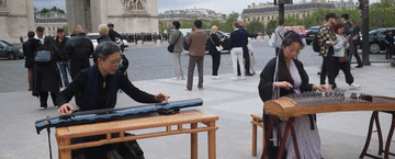 凱旋門下,神奇的一幕發(fā)生了,中國藝術家和法國軍樂隊同框演奏,巴黎街頭同時回蕩著中法兩國的音樂聲。