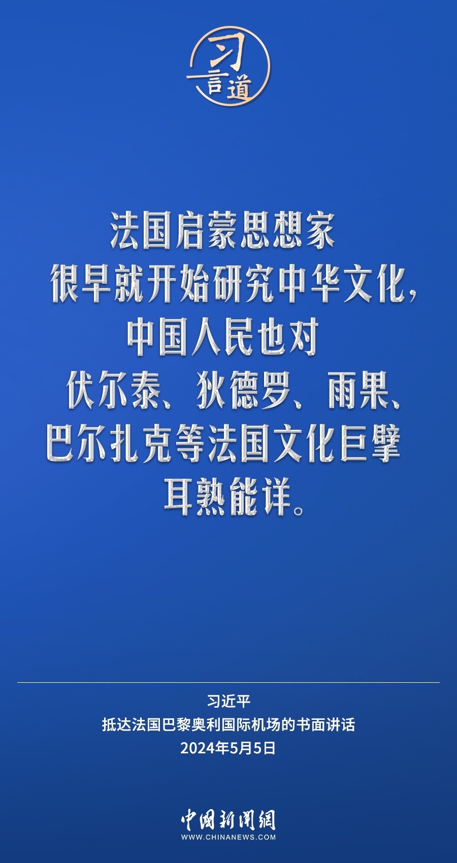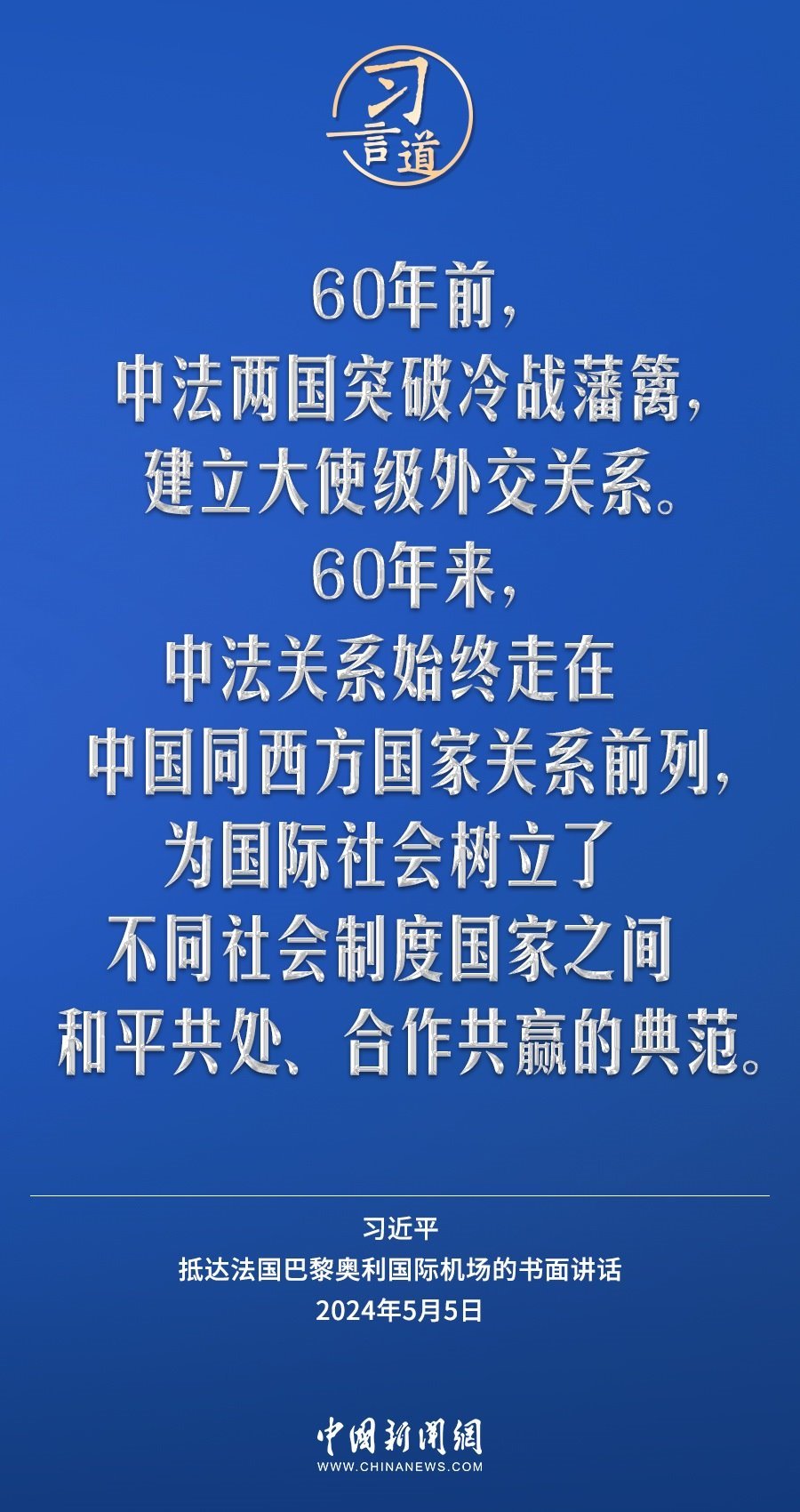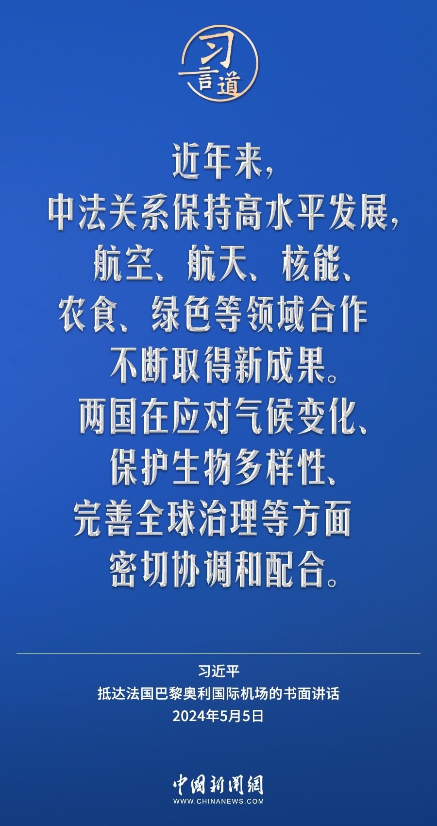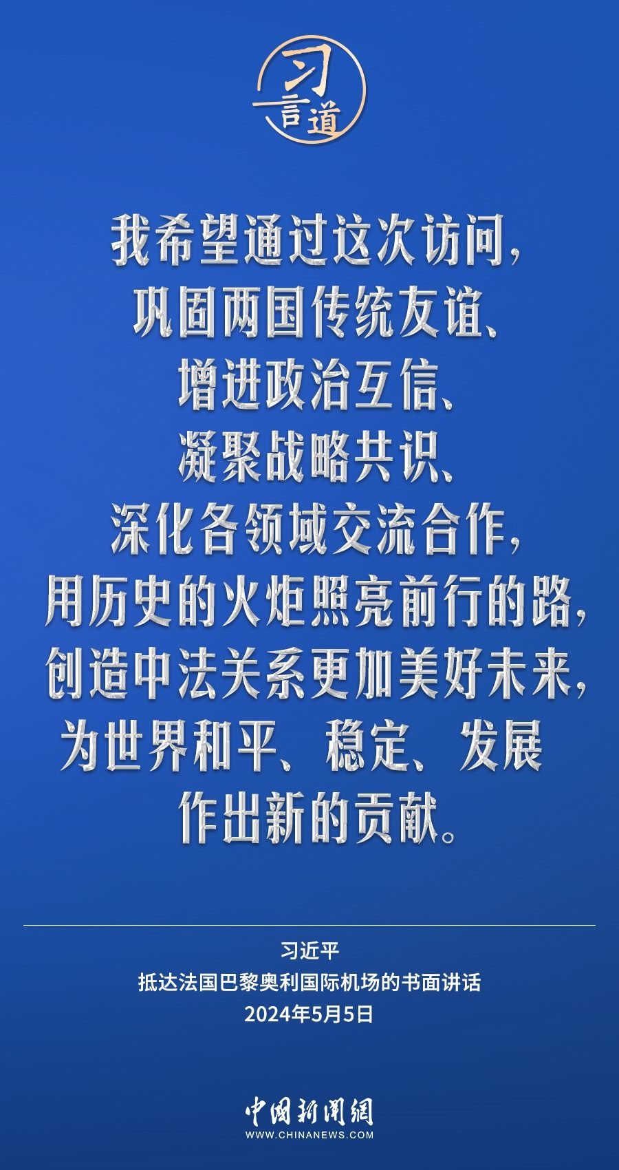 當?shù)貢r間5月5日下午,國家主席習近平抵達巴黎,開始對法國進行國事訪問。在抵達法國巴黎奧利國際機場的書面講話中,習近平指出——