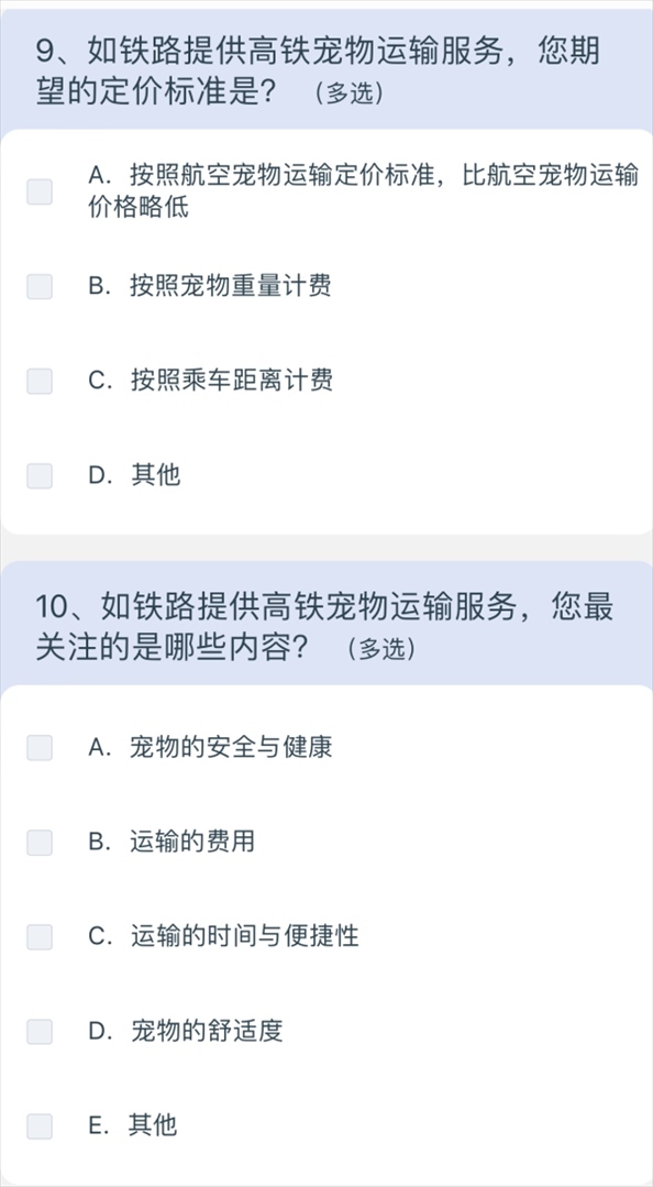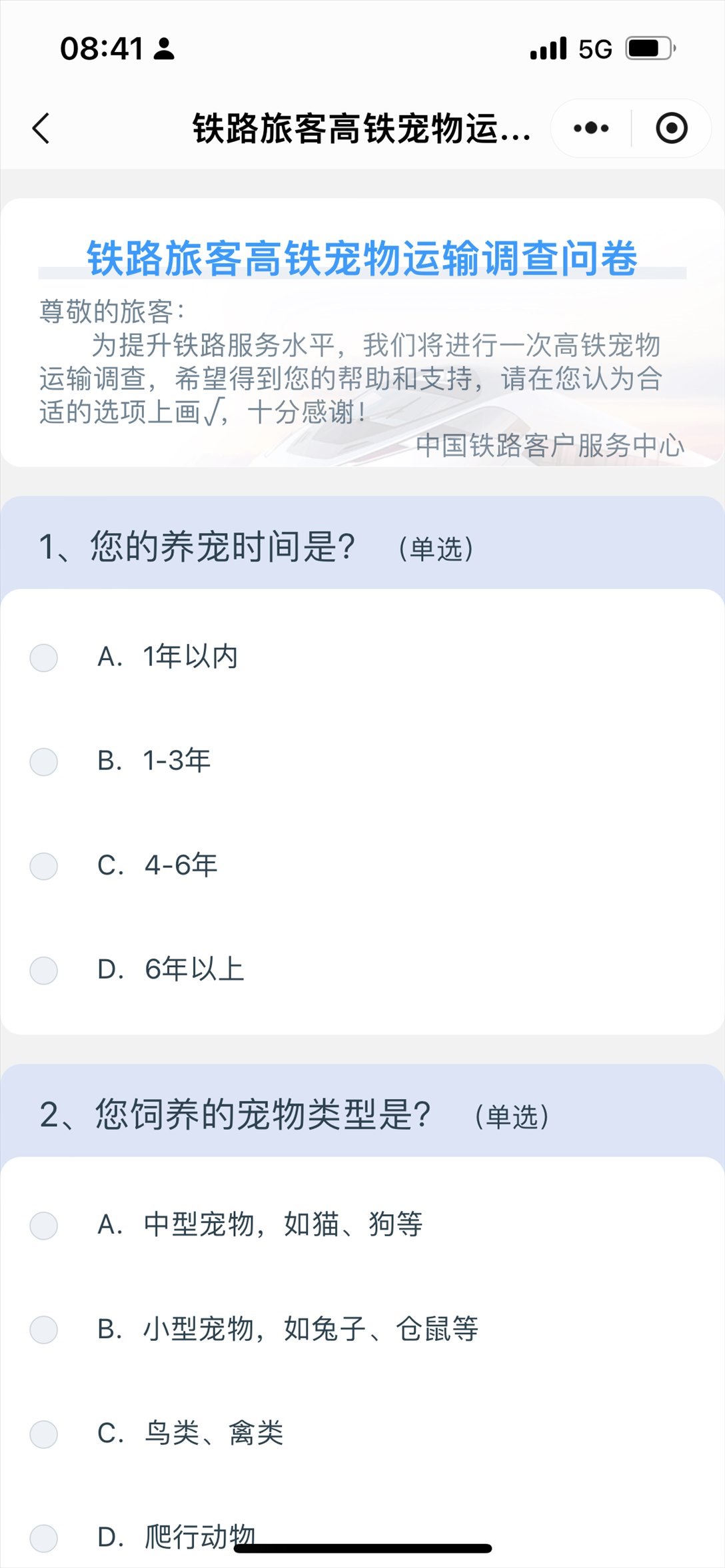 5月10日上午8點(diǎn)40分,澎湃新聞記者通過掃描網(wǎng)友分享的列車上的二維碼,進(jìn)入12306系統(tǒng),選擇問卷·建議,進(jìn)入“鐵路旅客高鐵寵物運(yùn)輸”調(diào)查,共15個(gè)問題,涉及養(yǎng)寵類型、是否有攜帶寵物出行的需求、如果鐵路提供寵物運(yùn)輸服務(wù)是否愿意嘗試等,以及為降低對其他旅客的影響,在高鐵寵物運(yùn)輸更關(guān)注哪方面的防護(hù);如鐵路提供高鐵寵物運(yùn)輸服務(wù),期望的定價(jià)標(biāo)準(zhǔn);如鐵路提供高鐵寵物運(yùn)輸服務(wù),最關(guān)注的內(nèi)容;如果是非養(yǎng)寵人士,對高鐵寵物運(yùn)輸有何建議等多方面問題。