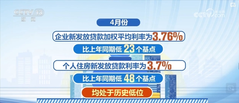 4月份,企業(yè)新發(fā)放貸款加權(quán)平均利率為3.76%,比上年同期低23個基點(diǎn);個人住房新發(fā)放貸款利率為3.7%,比上年同期低48個基點(diǎn),均處于歷史低位。