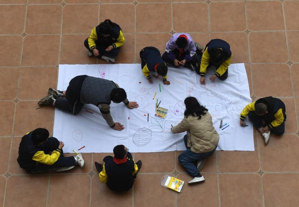 ?↑在廣西南寧高新區(qū)龍華學校,何冬艷教她照顧的學生畫畫(2023年3月31日攝)。