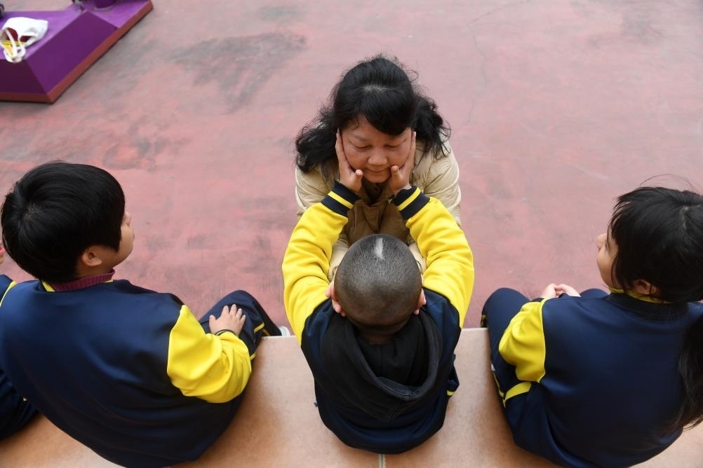 ?↑在廣西南寧高新區(qū)龍華學校,何冬艷和她照顧的孤獨癥學生在一起(2023年3月31日攝)。