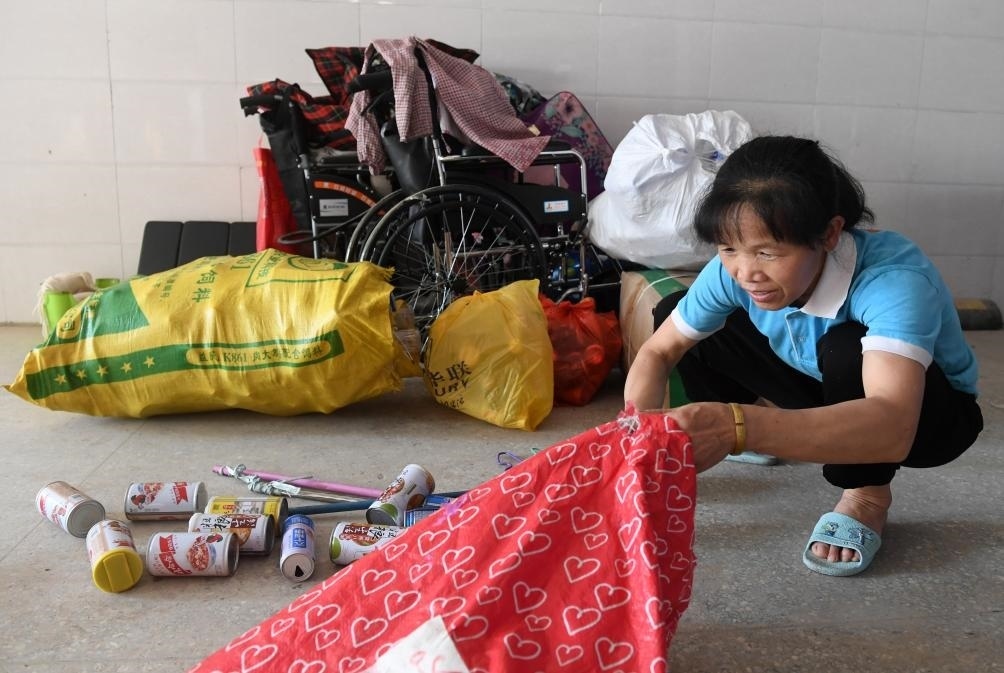 ?↑在廣西東蘭縣高級中學,黃乜鮮在收拾撿回來的廢舊物品(2020年5月9日攝)。