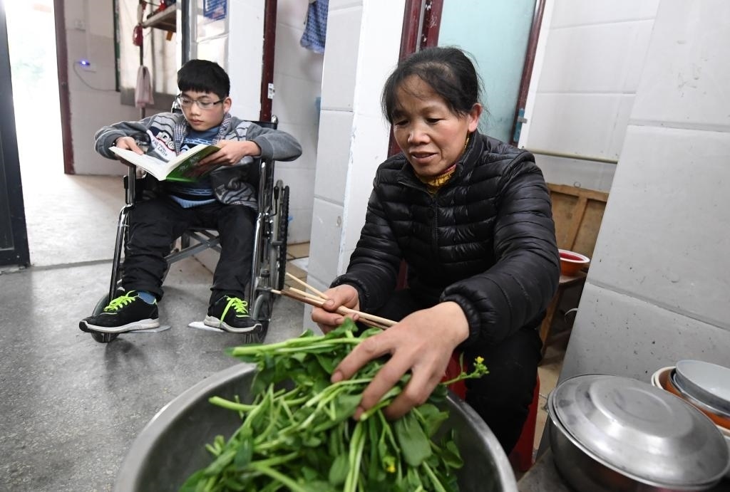 黃必華到縣城上高中后,黃乜鮮住到學校給他們母子倆免費提供的宿舍里,每天背兒子到教室上課,照顧兒子的生活,空閑時在學校小賣部打零工賺點生活費。