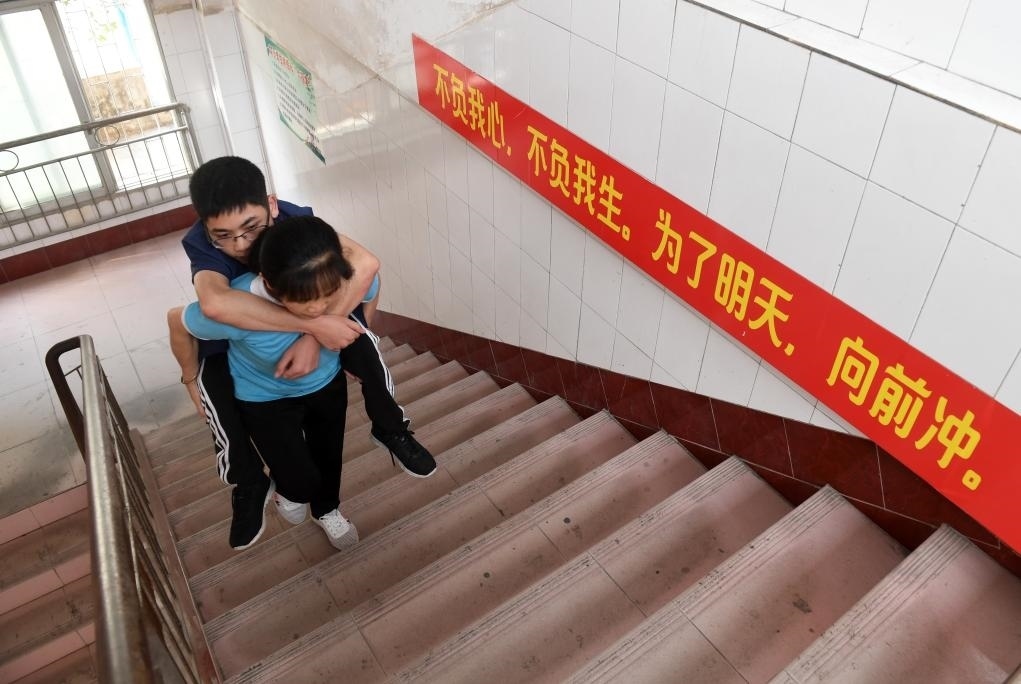 ?↑在廣西東蘭縣高級中學,黃乜鮮背著兒子黃必華前往6樓的教室(2020年5月9日攝)。