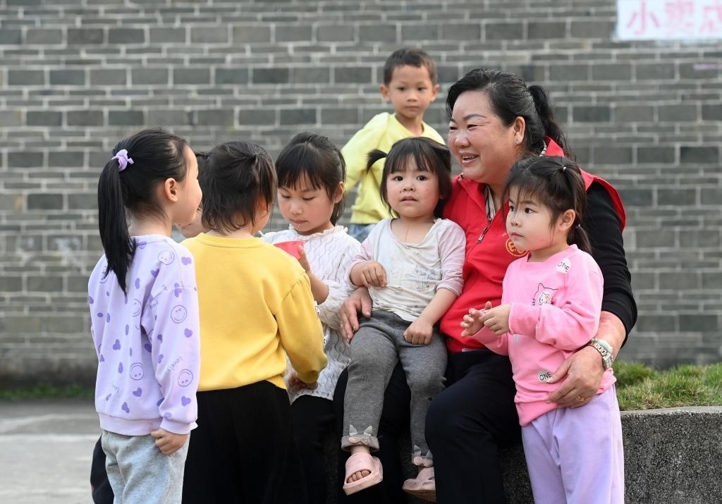 ?↑在廣西賓陽縣中華鎮(zhèn)的一個“留守兒童之家”活動室外,張清秀和孩子們交流(2024年3月5日攝)。