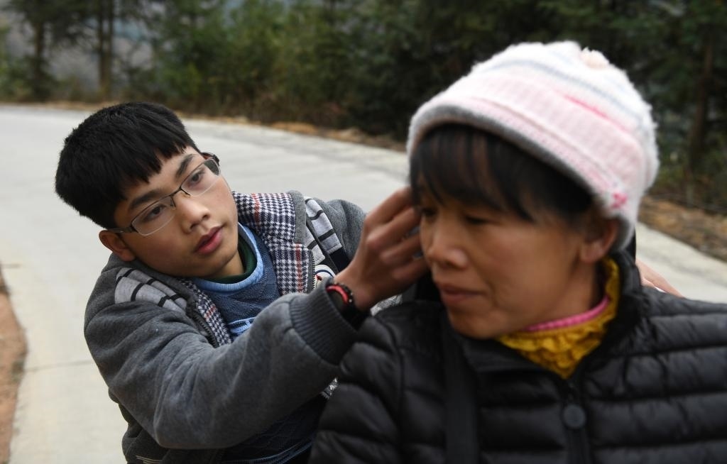 ↑黃必華在上學路上為媽媽黃乜鮮整理帽子擋風(2018年2月26日攝)。