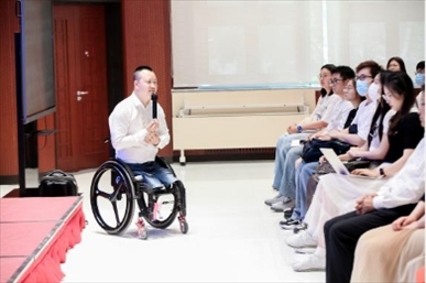 ?下圖為2023年5月,作為四川殘疾人勵志報告團成員的代國宏走進北京大學,與學生交流。(四川省殘聯(lián)供圖)