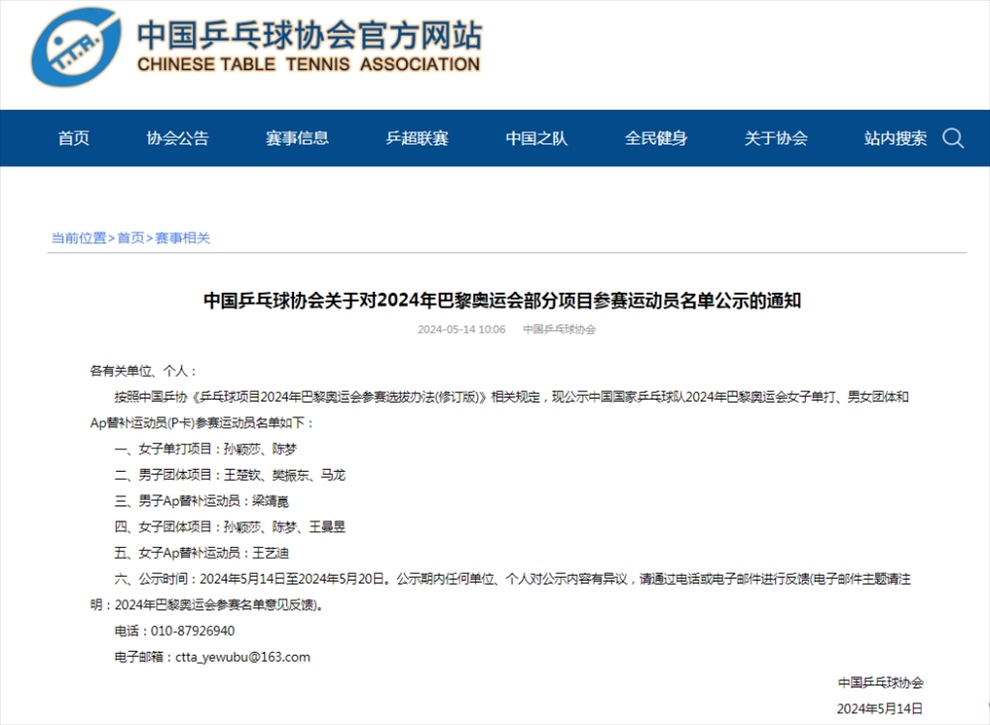 ·中國乒協(xié)公示巴黎奧運會女單、男女團(tuán)參賽運動員名單。