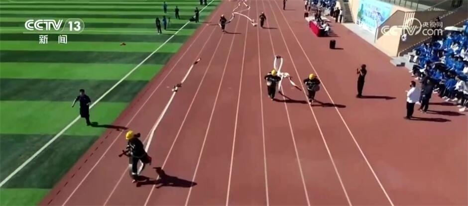 發(fā)令員一聲哨響,幾名消防員手持水槍水帶,飛快向前沖出。這是在山東濟(jì)寧某中學(xué)舉行的首屆“消防安全運(yùn)動(dòng)會(huì)”上,消防員模擬救援現(xiàn)場進(jìn)行的四百米五帶三槍操法展示。