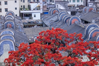 廣州市,白云區(qū)龍歸南村周氏大宗祠鳳凰花開,嶺南鑊耳屋頂與火紅的鳳凰花交相輝映。