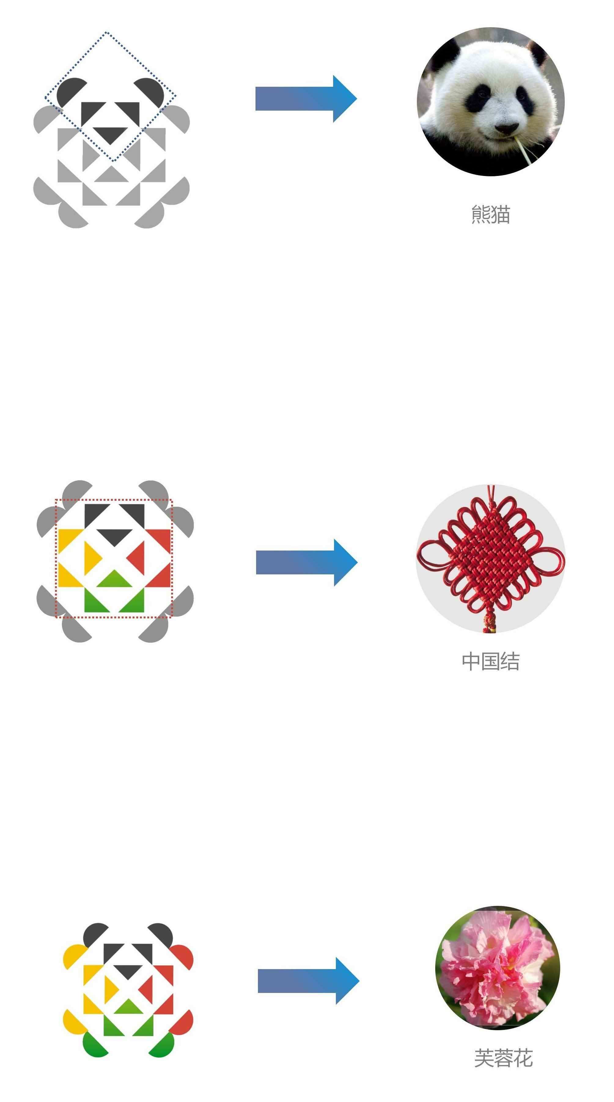 會徽設(shè)計(jì)靈感源于中國的大熊貓、芙蓉花和中國結(jié),以中國紅、金沙黃、公園綠、熊貓黑、雪山白為主色調(diào)。作為 2025 年成都世界運(yùn)動會的重要標(biāo)志,這一會徽有效傳達(dá)了奧林匹克精神又凸顯了中國傳統(tǒng)元素和成都特色,彰顯了“團(tuán)結(jié)、包容、多樣性”的價值觀。同時,設(shè)計(jì)師秉承色彩明快、造型簡潔的設(shè)計(jì)理念,其外圍的半圓圖案和內(nèi)部排列的三角形,圍成一朵盛開的芙蓉花;紅、黑、黃、綠、白的幾何色塊拼出可愛的卡通大熊貓。