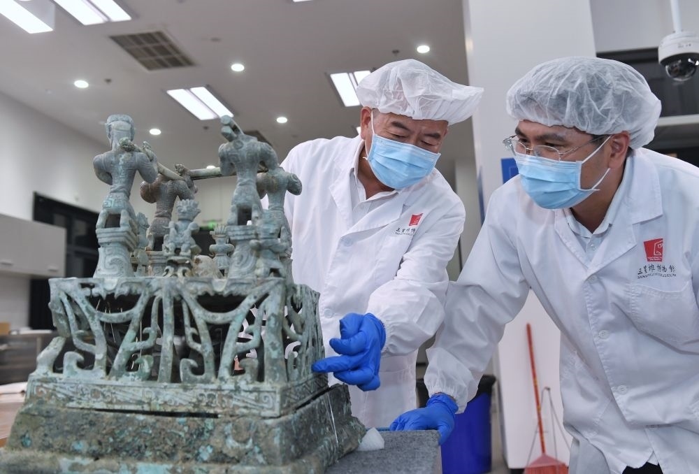 2023年5月30日,在四川三星堆博物館文物保護和修復(fù)中心,三星堆博物館陳列保管部副部長郭漢中(左)與同事討論神壇底座修復(fù)方案。