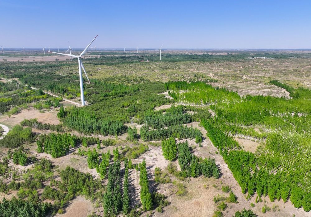 ?這是在內(nèi)蒙古通遼市科爾沁沙地“雙百萬畝”綜合治理工程努古斯臺項目區(qū)拍攝的風力發(fā)電機組(2024年5月15日攝,無人機照片)。新華社記者 連振 攝