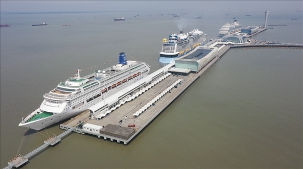 5月22日,“愛達(dá)·魔都號(hào)”“海洋光譜號(hào)”和“鼓浪嶼號(hào)”三艘郵輪??吭趨卿量趪?guó)際郵輪港(無(wú)人機(jī)照片)。(上海邊檢總站供圖)
