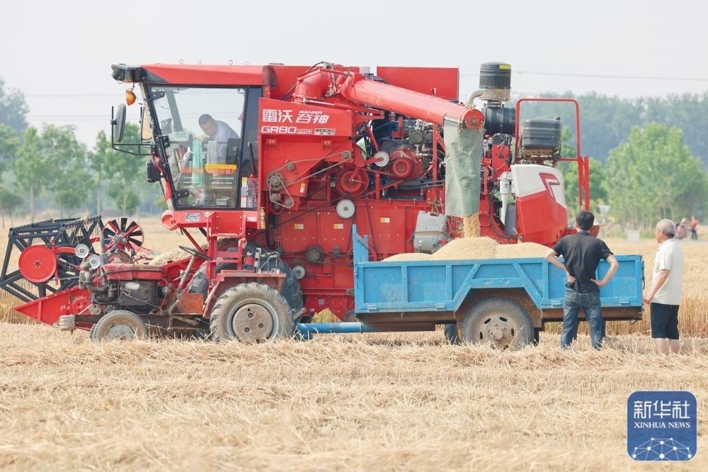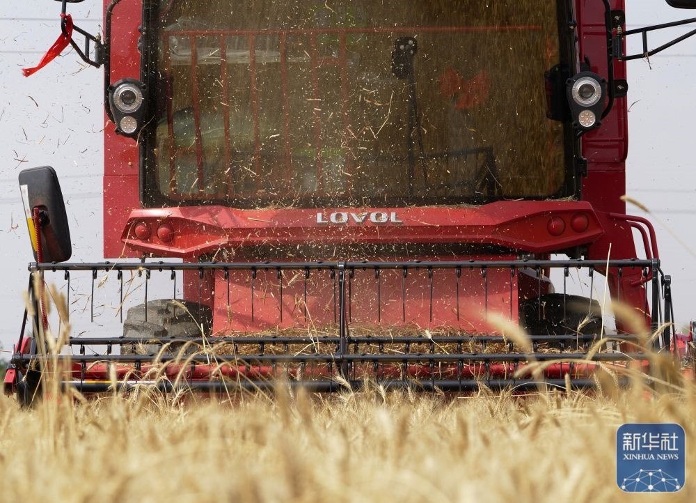 5月26日,在河南省商丘市睢縣尚屯鎮(zhèn)荒莊村,農(nóng)民駕駛收割機(jī)搶收小麥。新華社發(fā)(徐澤源攝)
