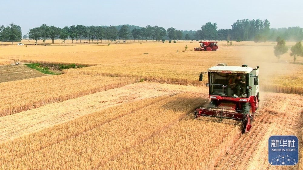 5月24日,河南省駐馬店市正陽(yáng)縣王勿橋鄉(xiāng)謝莊村村民在搶收小麥(無(wú)人機(jī)照片)。新華社發(fā)(高萬(wàn)寶攝)