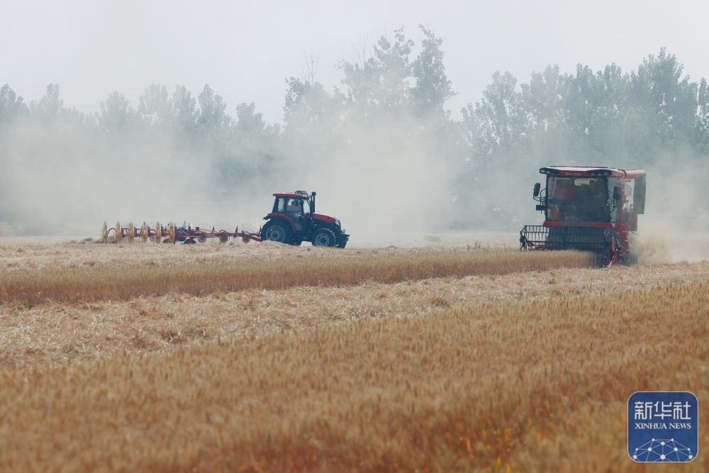 5月25日,在河南省駐馬店市汝南縣三橋鎮(zhèn)殷店村,收割機(jī)、秸稈摟草機(jī)在麥地里穿梭作業(yè)。新華社發(fā)(張萌攝)