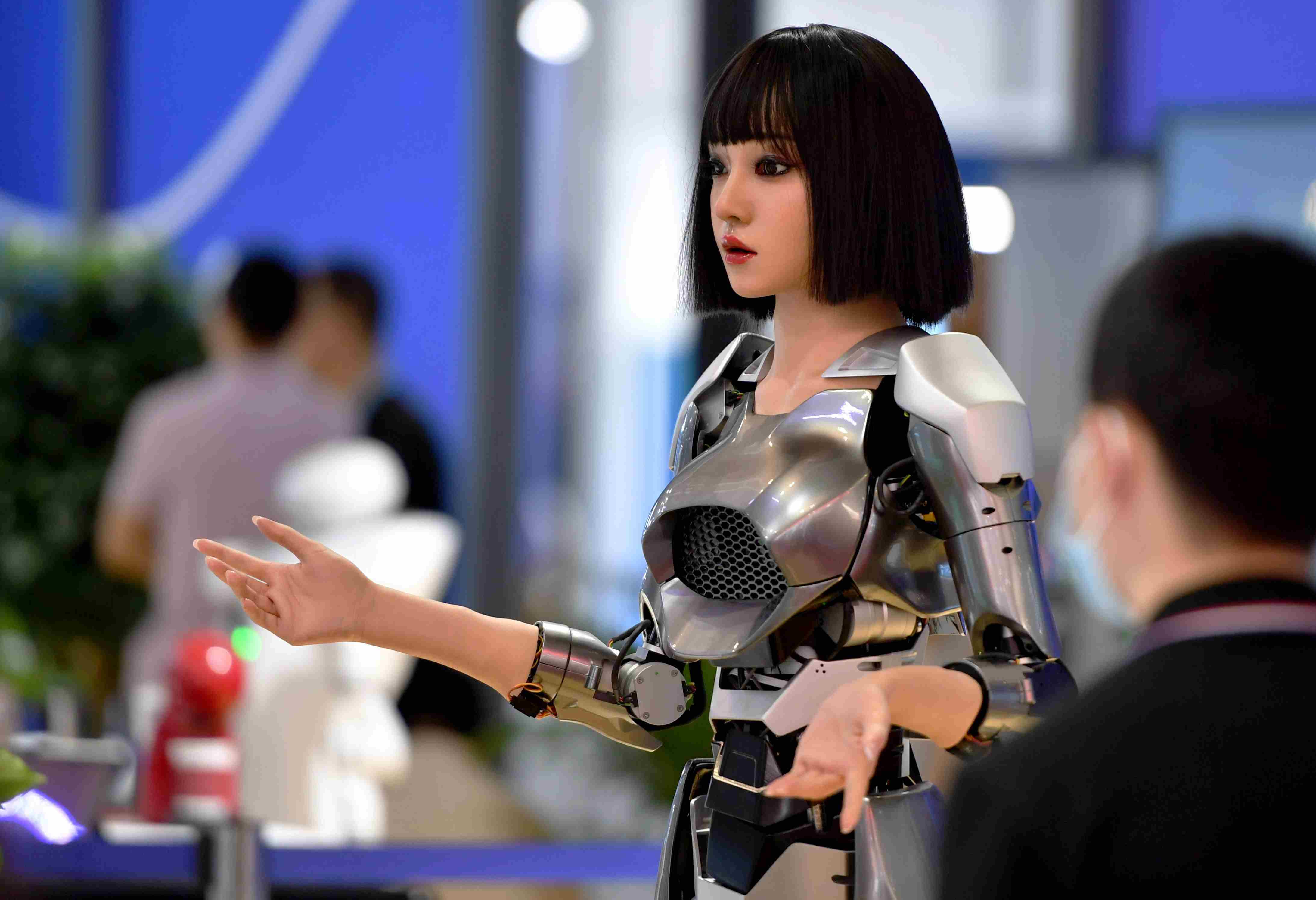 在現(xiàn)場體驗(yàn)區(qū),超仿生人形機(jī)器人“小柒”在向觀眾致意。 新華社記者魏培全 攝