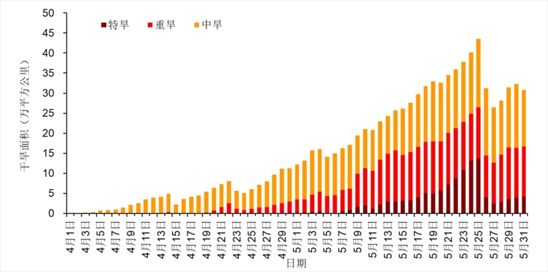 西南地區(qū)冬春連旱緩解,黃淮江淮干旱露頭發(fā)展。今年以來由于溫高雨少,我國西南地區(qū)出現(xiàn)冬春連旱,4月17日重旱及以上面積(32.6萬平方公里)、特旱面積(13萬平方公里)達到峰值。進入5月后出現(xiàn)多次降水過程,冬春連旱緩解。4月以來,黃淮、江淮等地氣象干旱開始露頭并發(fā)展。至5月25日,中旱及以上等級干旱面積(43.6萬平方公里)和特旱面積(13.7萬平方公里)均達最大(圖6)。目前,黃淮中部、江淮北部、江漢東部等地仍存在中度及以上等級氣象干旱。5月31日,魯豫皖蘇鄂五省中旱以上干旱面積30.8萬平方公里,其中重旱12.4萬平方公里,特旱4.3萬平方公里(圖7)。