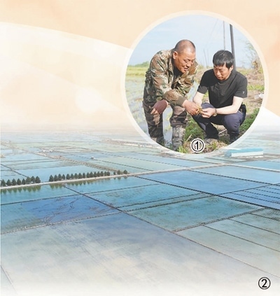 圖①:于海河(右)在田間地頭和村民一起查看水稻長(zhǎng)勢(shì)。 本報(bào)記者 方 圓攝圖②:完成了機(jī)械化插秧的水稻田?;⒘质形麄鞑抗﹫D