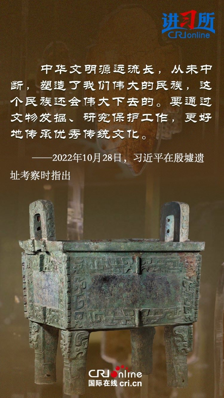 文物和文化遺產(chǎn)承載燦爛文明,傳承歷史文化,維系民族精神。三星堆博物館、殷墟遺址、敦煌研究院……這些年,習(xí)近平高度重視中華文明探源工程和文物保護(hù)工作,強(qiáng)調(diào)要把中華文明歷史引向深入,把中華優(yōu)秀傳統(tǒng)文化一代一代傳下去。
