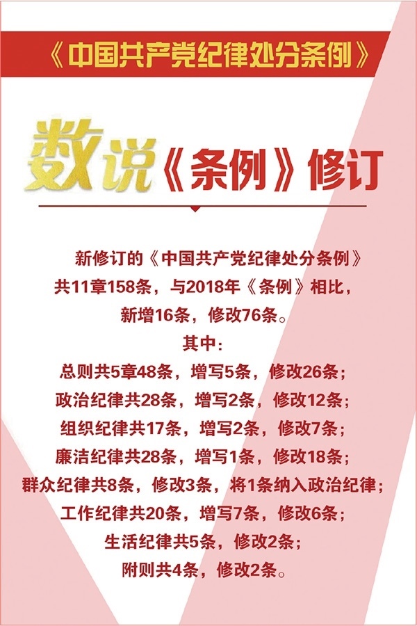 2023年新修訂的《中國(guó)共產(chǎn)黨紀(jì)律處分條例》,與時(shí)俱進(jìn)完善紀(jì)律規(guī)范,與2018年《條例》相比,新增16條,修改76條,進(jìn)一步扎緊織密制度籠子。