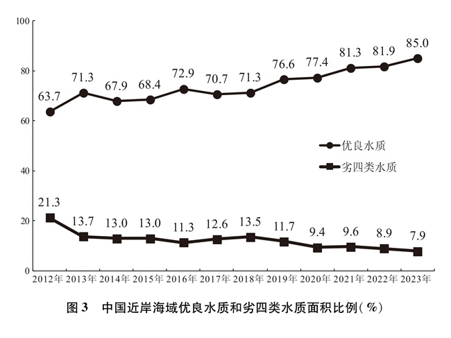 通過深入推進(jìn)重點(diǎn)海域綜合治理、陸海污染協(xié)同防治,持續(xù)建設(shè)美麗海灣,中國近岸海域水質(zhì)總體改善,2023年優(yōu)良水質(zhì)面積比例較2012年高出21.3個(gè)百分點(diǎn)。