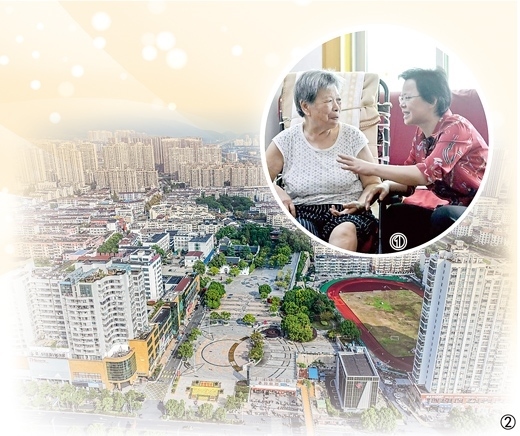 圖①:趙玉蓮(右)正在看望社區(qū)居民。圖②:寶城社區(qū)鳥(niǎo)瞰。以上圖片均為安宣寶攝