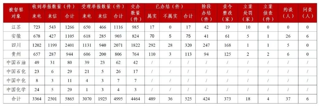 截至10月30日20時,各督察組共收到群眾來電、來信舉報5865件,受理有效舉報4995件,經(jīng)梳理合并重復舉報,累計向被督察對象轉(zhuǎn)辦4464件。被督察對象已辦結(jié)或階段辦結(jié)949件,其中立案處罰18家;立案偵查4件;約談黨政領(lǐng)導干部37人,問責黨政領(lǐng)導干部6人。