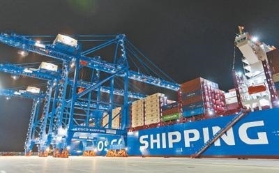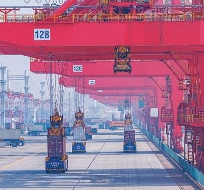 軟聯通共建“一帶一路”國家在工作制度對接、技術標準協調、檢驗結果互認等方面強化合作、統(tǒng)一標準,貿易自由化便利化水平不斷提升。上海洋山港海關對接共建國家進出口貨物相關標準,推動通關一體化方式申報,提升通關效率。圖為無人駕駛的全自動導引車在洋山港穿梭往來,搬運集裝箱。王 初攝(影像中國)