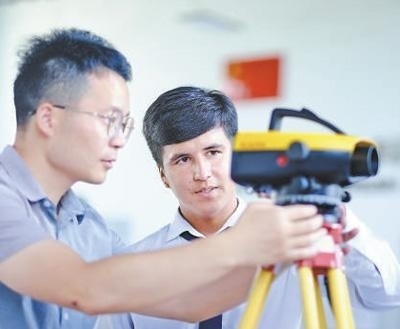 心聯通在塔吉克斯坦首都杜尚別的魯班工坊,來自天津城市建設管理職業(yè)技術學院的老師(左)為當地學生提供指導。新華社記者 鄭開君攝