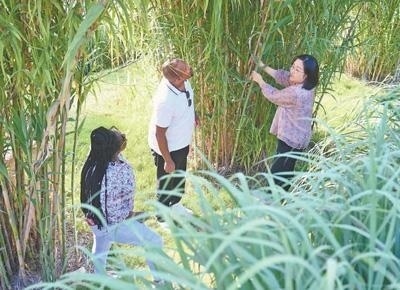 心聯通福建農林大學國際菌草工程技術研究中心工作人員(右)在向盧旺達留學生介紹菌草品種“綠洲1號”蘆竹的生長情況。新華社記者 林善傳攝