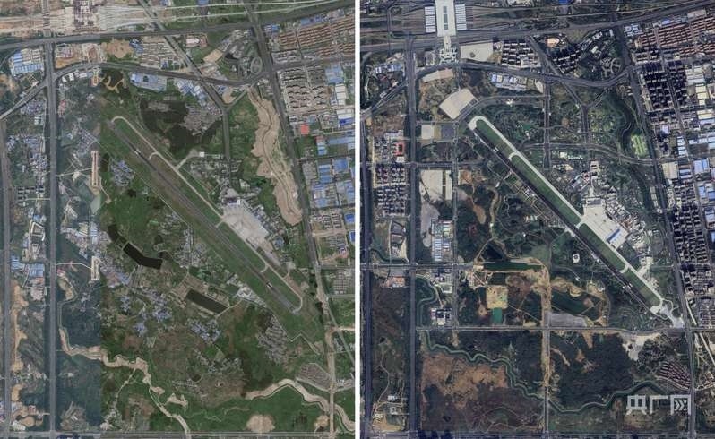 駱崗公園改造前后鳥(niǎo)瞰對(duì)比圖,左圖為2013年,右圖為2024年(央廣網(wǎng)發(fā) 中科星圖供圖)