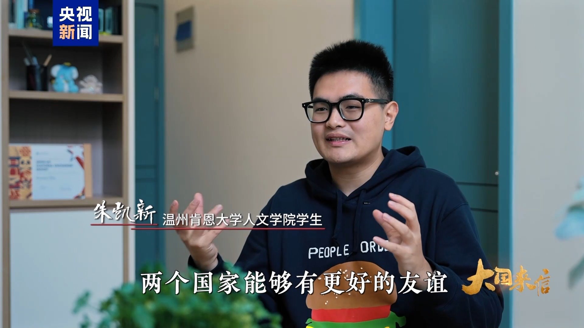 溫州肯恩大學(xué)人文學(xué)院學(xué)生 朱凱新:我也是非常非常期待每一位美國(guó)朋友來(lái)到我們中國(guó),來(lái)到我們真正的這塊土地上去看看我們到底是什么樣子的。我希望能夠讓中國(guó)和美國(guó)兩個(gè)國(guó)家能夠有更好的友誼。