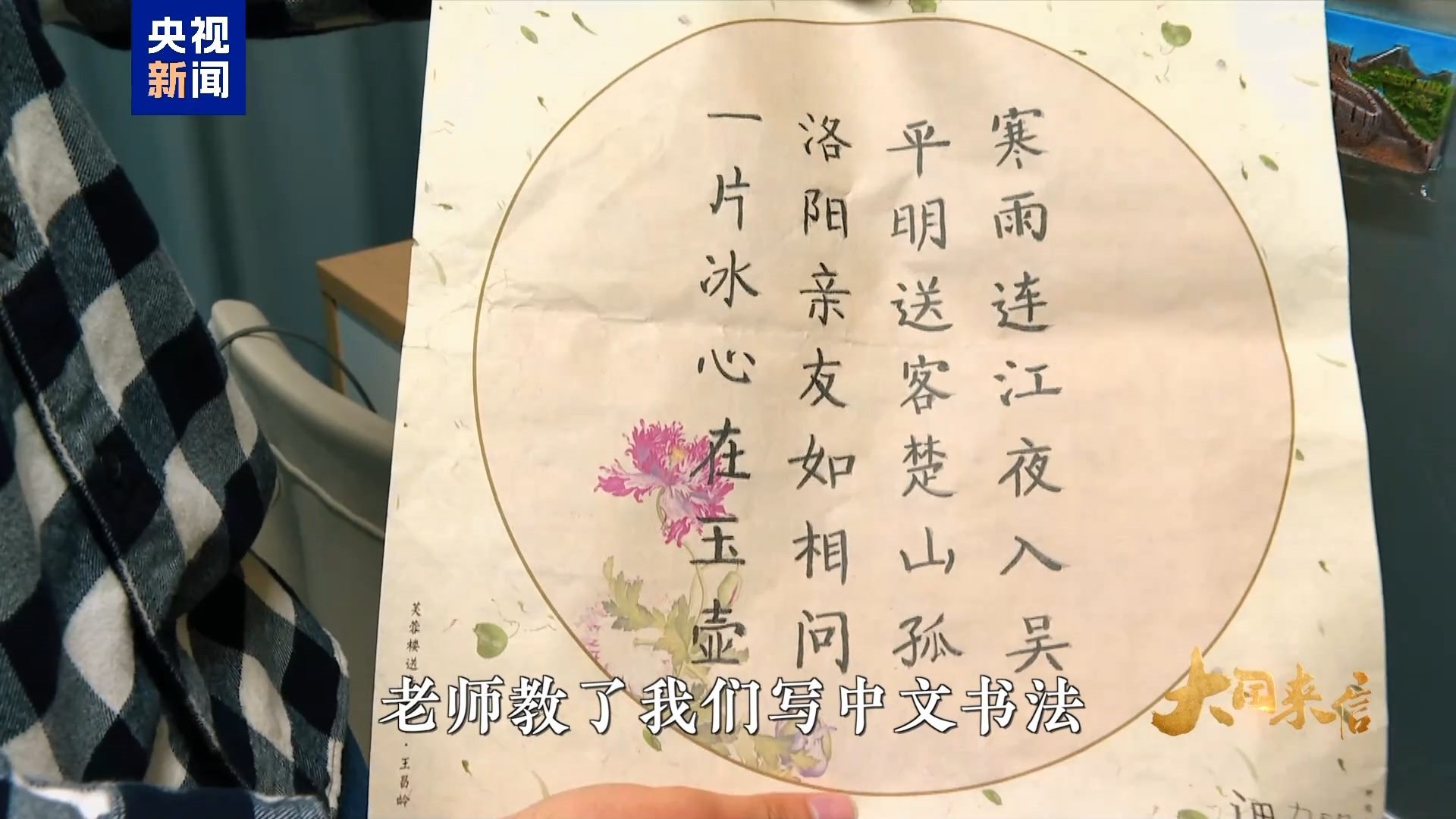 美國(guó)肯恩大學(xué)學(xué)生 亞歷山德羅·迪·雷奧:這些漢字是我們?cè)谥形恼n上寫(xiě)的,老師教了我們寫(xiě)中文書(shū)法,我們就寫(xiě)了這些。