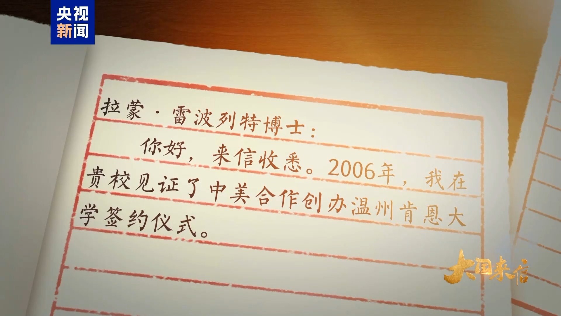 錦書(shū)云中來(lái),尺牘傳深情。2006年,時(shí)任浙江省委書(shū)記習(xí)近平在美國(guó)肯恩大學(xué)見(jiàn)證了中美合作創(chuàng)辦溫州肯恩大學(xué)的簽約儀式。自2014年設(shè)立以來(lái),溫州肯恩大學(xué)不僅培養(yǎng)了數(shù)千名中外學(xué)子,還推動(dòng)了中美兩國(guó)青年一代的友好交流。去年6月,習(xí)主席復(fù)信美國(guó)肯恩大學(xué)校長(zhǎng)拉蒙·雷波列特,鼓勵(lì)中美兩國(guó)高校加強(qiáng)交流合作,為促進(jìn)中美友好貢獻(xiàn)力量。