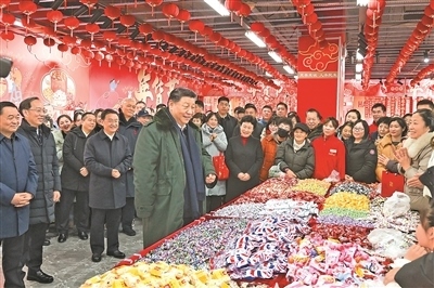 沈陽大東副食品商場(chǎng)歷史悠久,富有特色的年節(jié)商品琳瑯滿目。23日上午,習(xí)近平來到這里,察看多家店鋪,頻頻同店主和顧客交流,詳細(xì)了解節(jié)日期間市場(chǎng)供應(yīng)情況。大家見到總書記都十分激動(dòng),連聲歡呼“總書記好”!習(xí)近平對(duì)大家說,“菜籃子”、“米袋子”、“果盤子”是民生大事,現(xiàn)在物質(zhì)豐裕,過年團(tuán)圓更要讓大家吃得好、吃得健康。