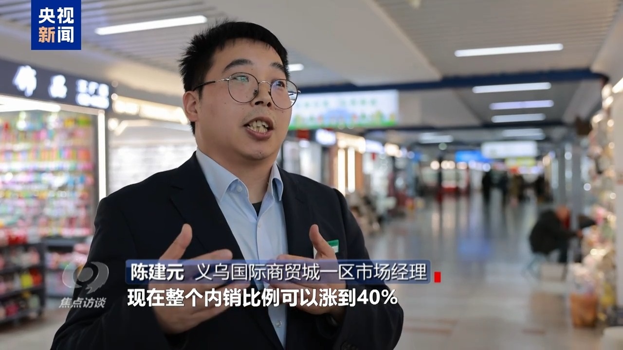 義烏國際商貿(mào)城一區(qū)市場經(jīng)理 陳建元:我們有一個統(tǒng)計,拿我們的飾品行業(yè)來說,經(jīng)過這幾年培育,直播電商的快速發(fā)展,有些經(jīng)營戶轉型,現(xiàn)在整個內(nèi)銷比例可以漲到40%,比例還是有一個很明顯的提升。