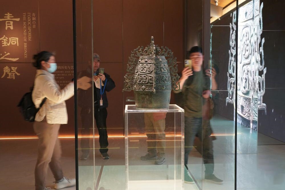 △2月26日,游客在西部機場博物館珍寶館內(nèi)參觀國家一級文物“秦公镈”。