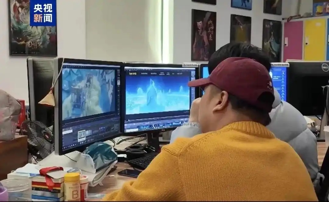 △《哪吒2》壯觀的特效背后,是全國138家動畫公司的合力托舉。圖為創(chuàng)作團隊正在確認畫面效果。
