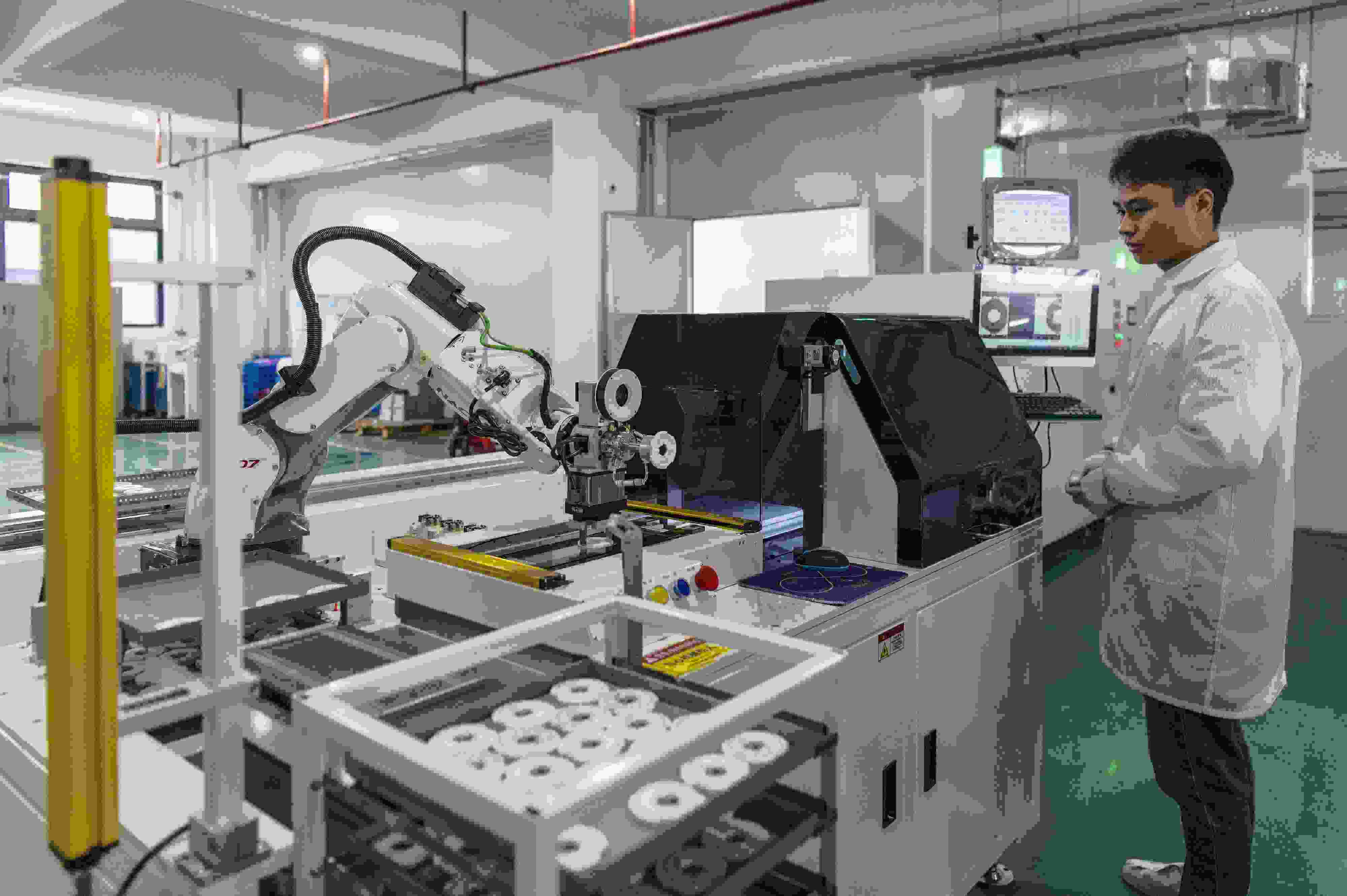 △2025年3月11日,在浙江省金華市浦江三思光電技術有限公司自動化生產(chǎn)線上,一只只機械臂靈活運轉(zhuǎn)著,趕訂單、忙生產(chǎn)。