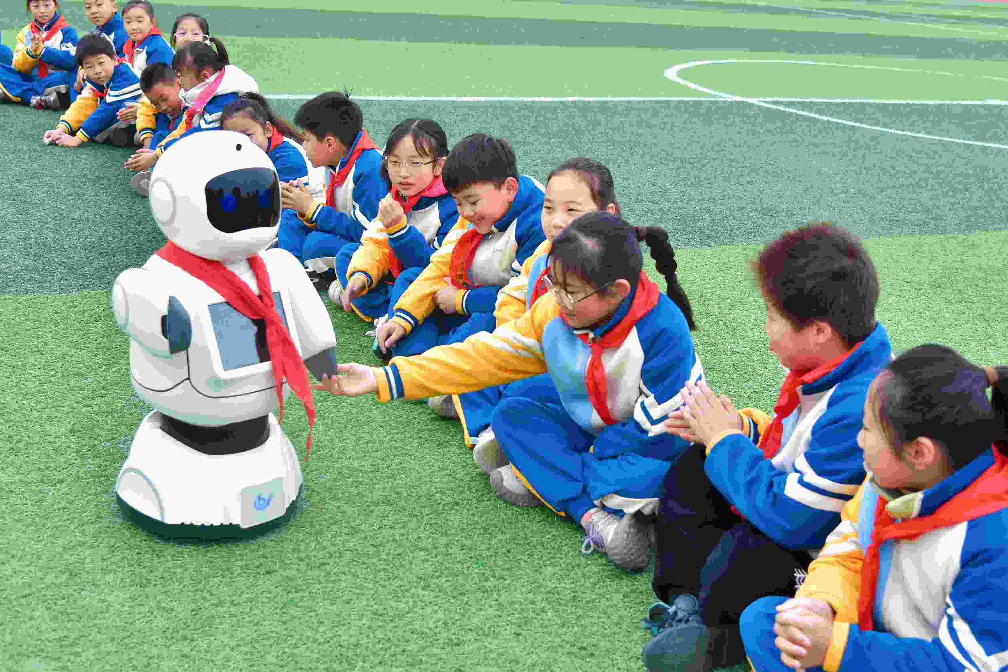 △2025年3月10日,江蘇南通,如皋經(jīng)濟技術開發(fā)區(qū)實驗小學課間,學生與智能機器人“賓果”互動。