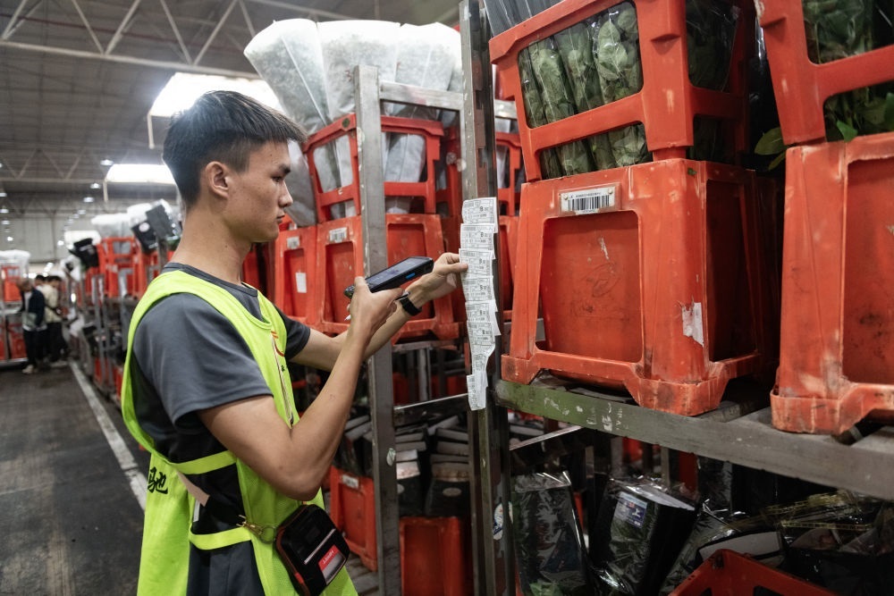 2023年7月13日,一名工作人員在昆明國際花卉拍賣交易中心內(nèi)對臺車上存放的鮮花掃碼。