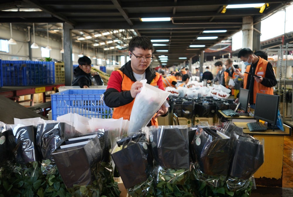 2022年11月11日,工作人員在昆明斗南花市給鮮花貼標簽。快遞物流時效不斷優(yōu)化、冷鏈運輸技術(shù)持續(xù)提升,也為中國鮮花加速“出?!北q{護航。