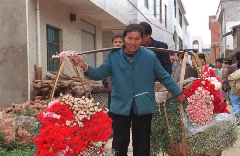 云南省昆明市呈貢龍街鄉(xiāng)斗南村是中國有名的“花鄉(xiāng)”,全村幾乎家家種花。這是一位當?shù)鼗ㄞr(nóng)挑著一擔(dān)鮮花去花卉交易市場出售(1999年6月2日發(fā))。