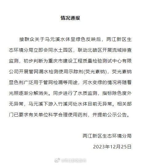 官方通報“重慶一公園管道排出不明液體將溪水染成熒光綠” 12月25日,重慶兩江新區(qū)生態(tài)環(huán)境分局通報,接群眾關(guān)于......