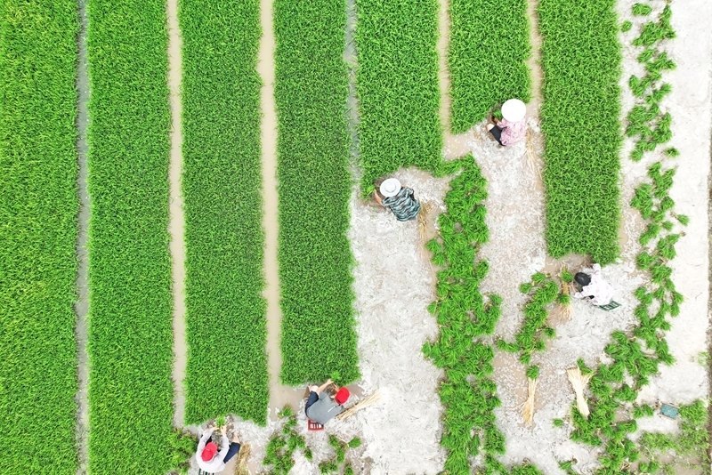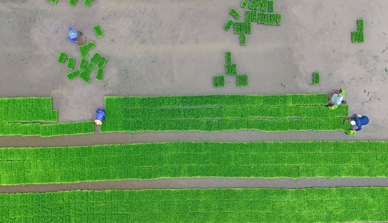 6月11日,在浙江省臺州市仙居縣雙廟鄉(xiāng),農(nóng)民在田間起運秧苗(無人機照片)。